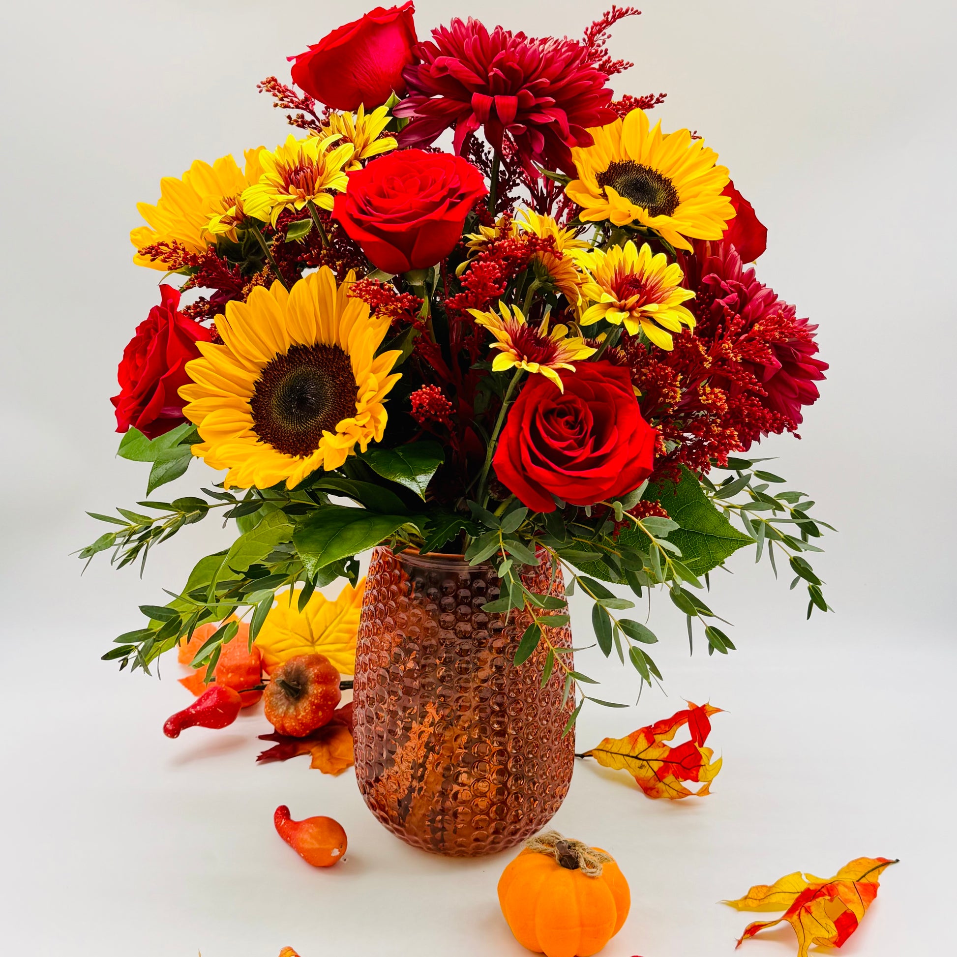 Experience the beauty of fall with Autumn Rose. Our stunning bouquet features vibrant autumn-colored flowers, complemented by elegant red roses and sunflowers. Perfect for adding warmth and charm to any space.