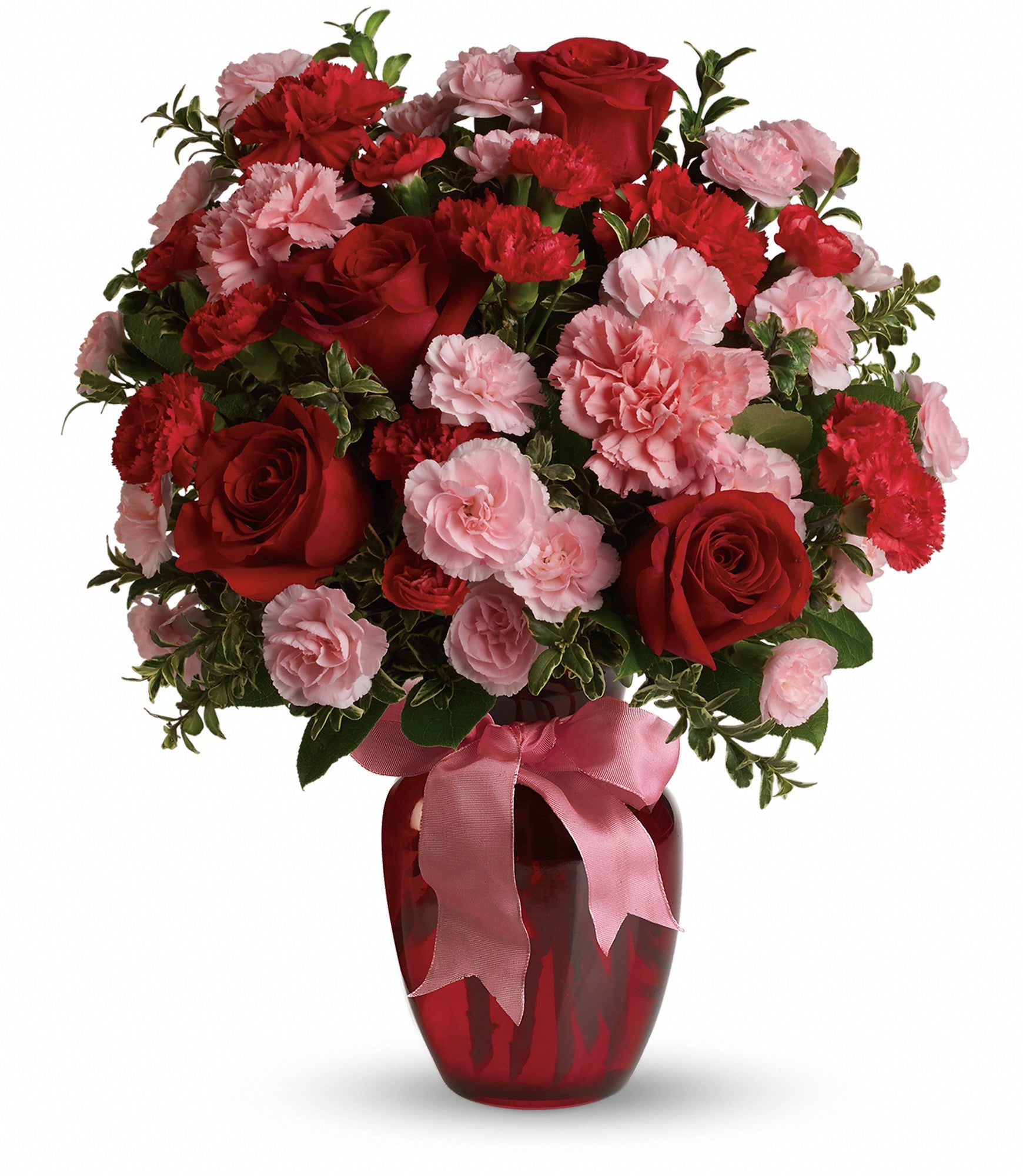 Dance With Me captures the romance of Valentine's Day in a stunning arrangement of vibrant blooms presented in an elegant red glass vase. This thoughtfully curated bouquet combines rich reds, soft pinks, and complementary greenery to create a sophisticated composition that speaks to love and devotion. The red vase serves as both a striking vessel and a symbolic nod to passion, making this arrangement perfect for expressing your deepest feelings. Whether celebrating an anniversary, proposing, or simply reminding someone how much they mean to you, this bouquet delivers elegance and emotion in one unforgettable gift.